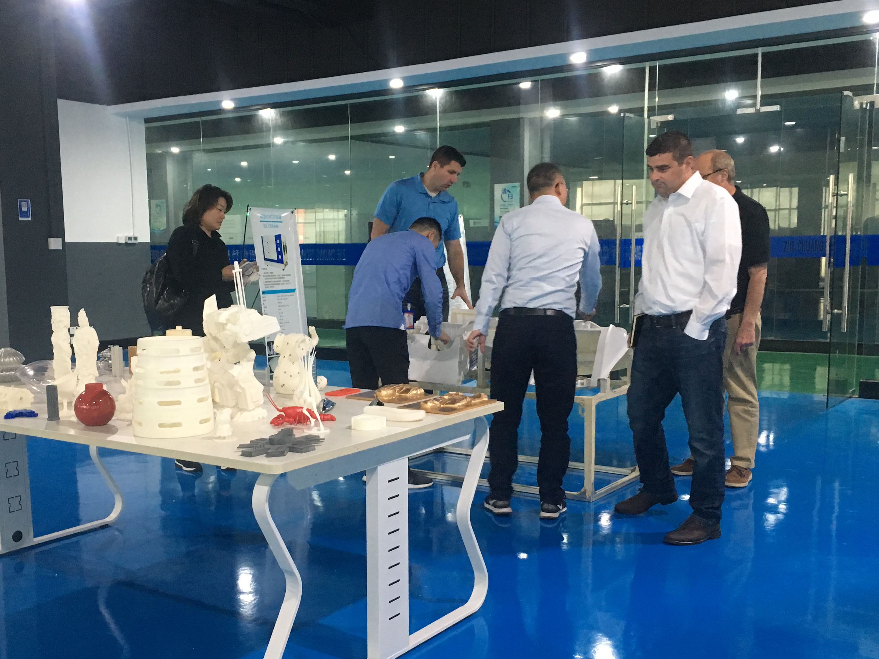 在陶董事長的帶領下,美國客戶一行先行參觀浙創科技3D打印車間。陶董事長詳細介紹了3D打印機的工作原理,并向美國客戶展示了打印完成的整套茶具模型。呈現在客戶面前的并不是最終的手板模型,還會通過專業的后處理進行加工,力求優質。針對美國客戶手板打印的需求,陶董事長提出通過“3D掃描+工業設計+3D打印”的一站式解決方案,為客戶打印樣品用于驗證,從而減少客戶的研發成本。