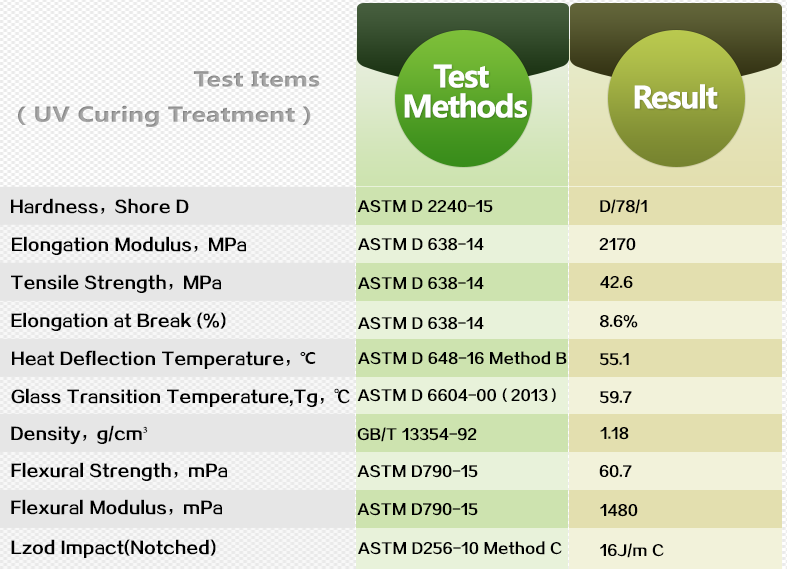 Printed parts have excellent moisture resistance, good chemical resistance, and low shrinkage