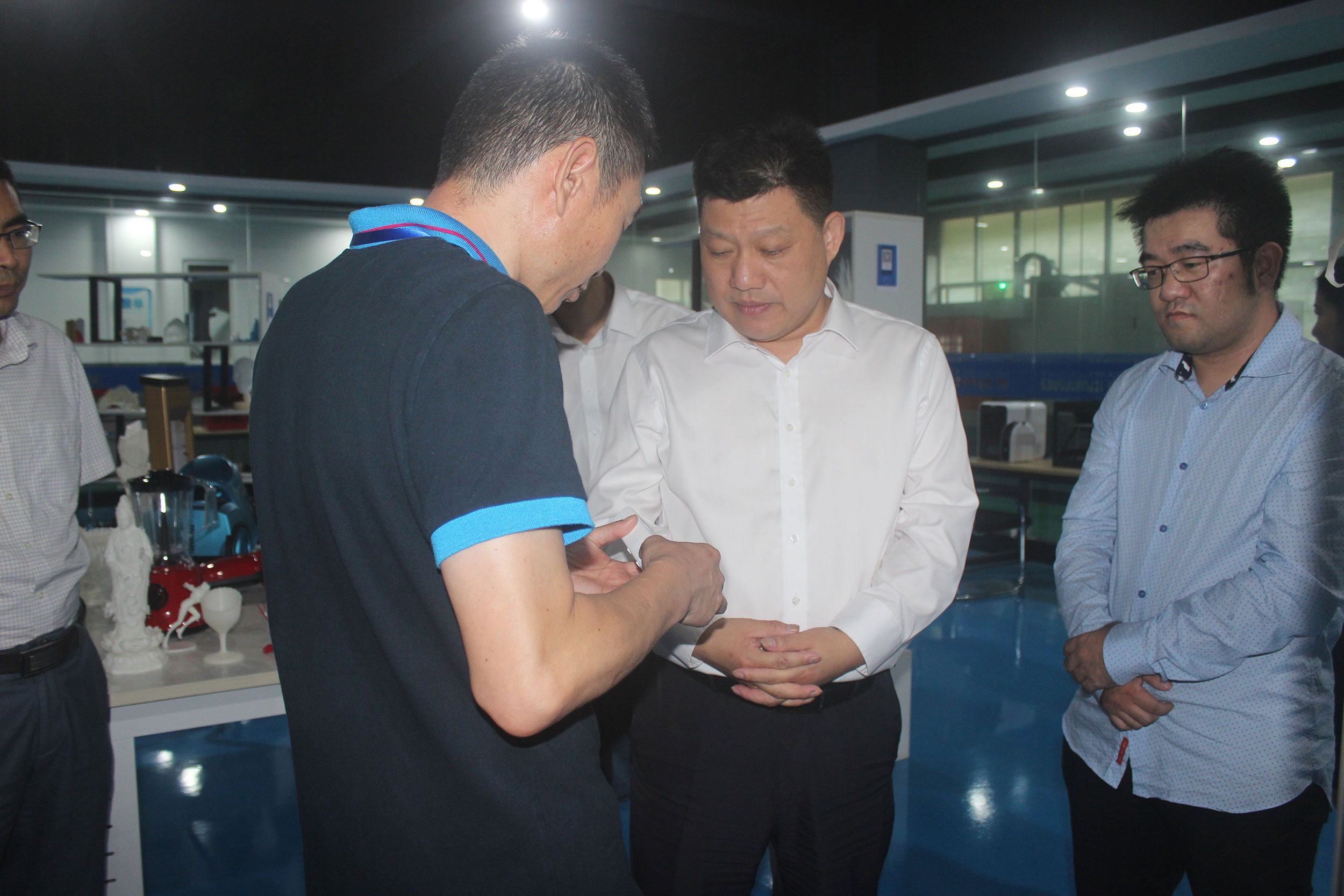 在3D打印產(chǎn)業(yè)園成立近一年之際,項(xiàng)敏市長再次調(diào)研浙創(chuàng)科技,陶董事長帶領(lǐng)項(xiàng)敏市長一行參觀3D打印車間和樣品間,展示近期最新研究成果,并就這大半年來浙創(chuàng)科技的業(yè)務(wù)發(fā)展、研發(fā)成果和人才合作等各方面向項(xiàng)敏市長一行進(jìn)行了詳細(xì)的匯報(bào)。