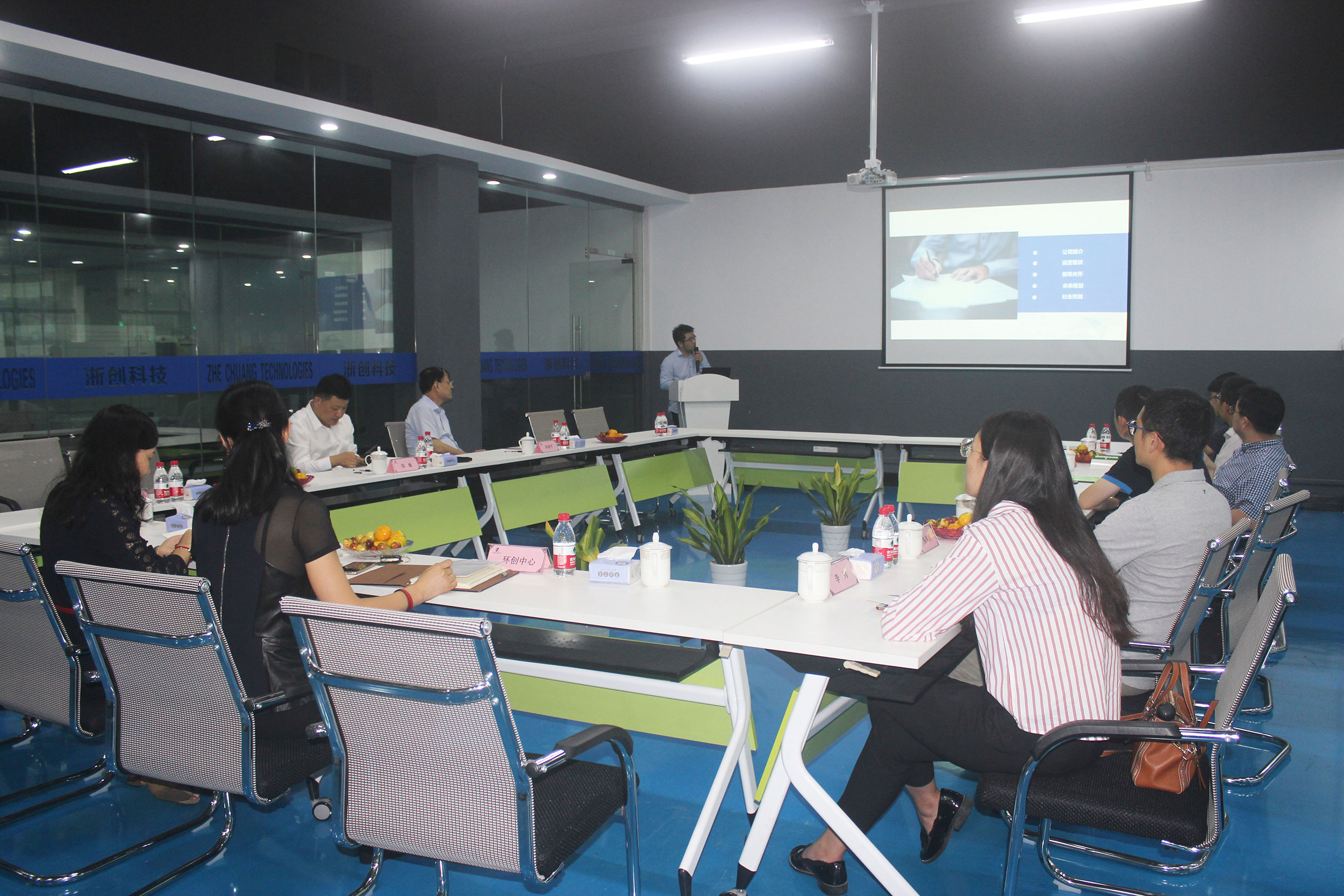 陶總經(jīng)理講解結(jié)束后,由任召輝教授代表浙江大學(xué)材料科學(xué)與工程學(xué)院發(fā)言。任教授說道:浙大浙創(chuàng)新材料聯(lián)合研發(fā)中心從去年合作至今一年多,浙大材料學(xué)院主要提供技術(shù)支持,并定期現(xiàn)場討論,提出解決方案。目前研發(fā)中心主要研發(fā)高分子材料,日后會(huì)擴(kuò)展到陶瓷、金屬材料。